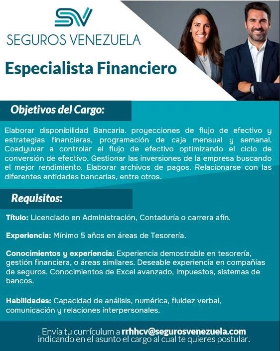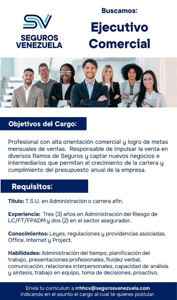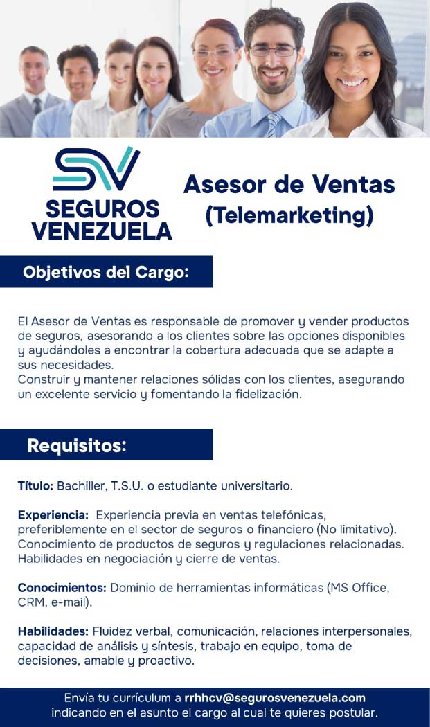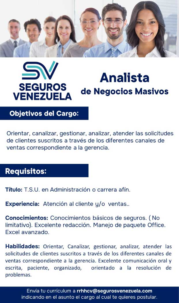 Si tienes el perfil requerido en nuestras Búsquedas de Talentos, sólo debes enviar tu Curriculum Vitae (CV) a rrhhcv@segurosvenezuela.com indicando el cargo al que deseas postularte